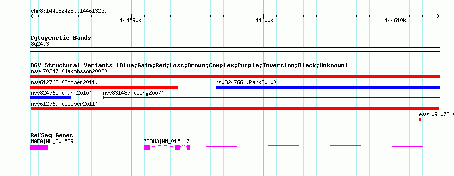 | | Variant Type | CNV loss | | Copy Number | | | Allele State | | | Allele Origin | | | Probe Count | | | Validation Flag | | | Merged Status | M | | Merged Variants | | | Supporting Variants | nssv1125286 | | Samples | | | Known Genes | MAFA, ZC3H3 | | Method | SNP array | | Analysis | Illumina SNP array copy number analysis | | Platform | Not reported | | Comments | | | Reference | Cooper_et_al_2011 | | Pubmed ID | 21841781 | | Accession Number(s) | nsv612769