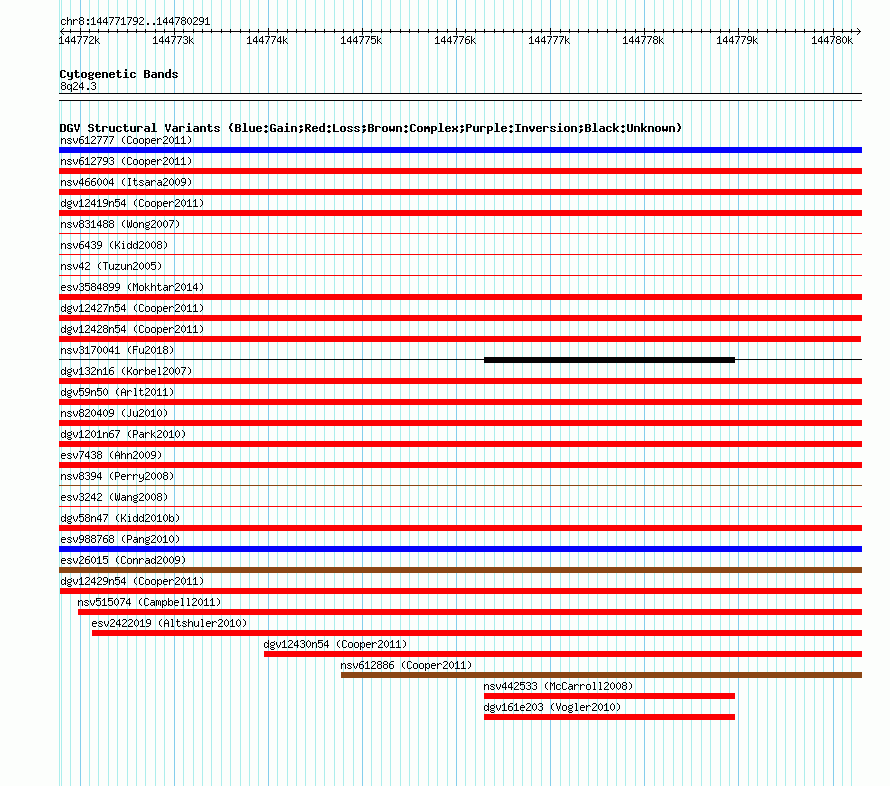 Variant DetailsVariant: nsv612863| Internal ID | 16400272 | | Landmark | | | Location Information | | | Cytoband | 8q24.3 | | Allele length | | Assembly | Allele length | | hg38 | 8500 | | hg19 | 8500 | | hg18 | 8500 |
