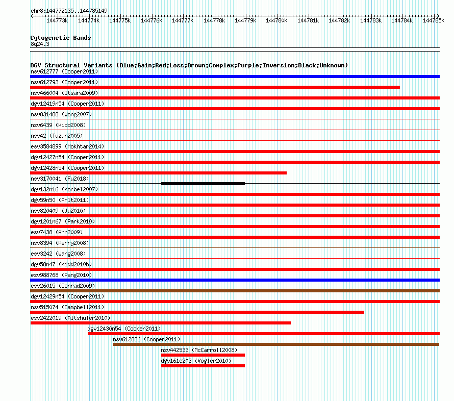 Variant DetailsVariant: nsv612874| Internal ID | 16400283 | | Landmark | | | Location Information | | | Cytoband | 8q24.3 | | Allele length | | Assembly | Allele length | | hg38 | 13015 | | hg19 | 13015 | | hg18 | 13015 |