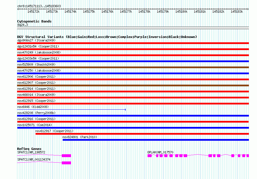 | Variant Type | CNV loss | Copy Number | | Allele State | | Allele Origin | | Probe Count | | Validation Flag | | Merged Status | M | Merged Variants | | Supporting Variants | nssv1125770 | Samples | | Known Genes | OPLAH, SPATC1 | Method | SNP array | Analysis | Illumina SNP array copy number analysis | Platform | Not reported | Comments | | Reference | Cooper_et_al_2011 | Pubmed ID | 21841781 | Accession Number(s) | nsv612916