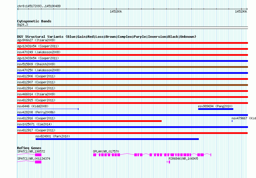 | Variant Type | CNV loss | Copy Number | | Allele State | | Allele Origin | | Probe Count | | Validation Flag | | Merged Status | M | Merged Variants | | Supporting Variants | nssv1125771 | Samples | | Known Genes | MIR6846, OPLAH, SPATC1 | Method | SNP array | Analysis | Illumina SNP array copy number analysis | Platform | Not reported | Comments | | Reference | Cooper_et_al_2011 | Pubmed ID | 21841781 | Accession Number(s) | nsv612917