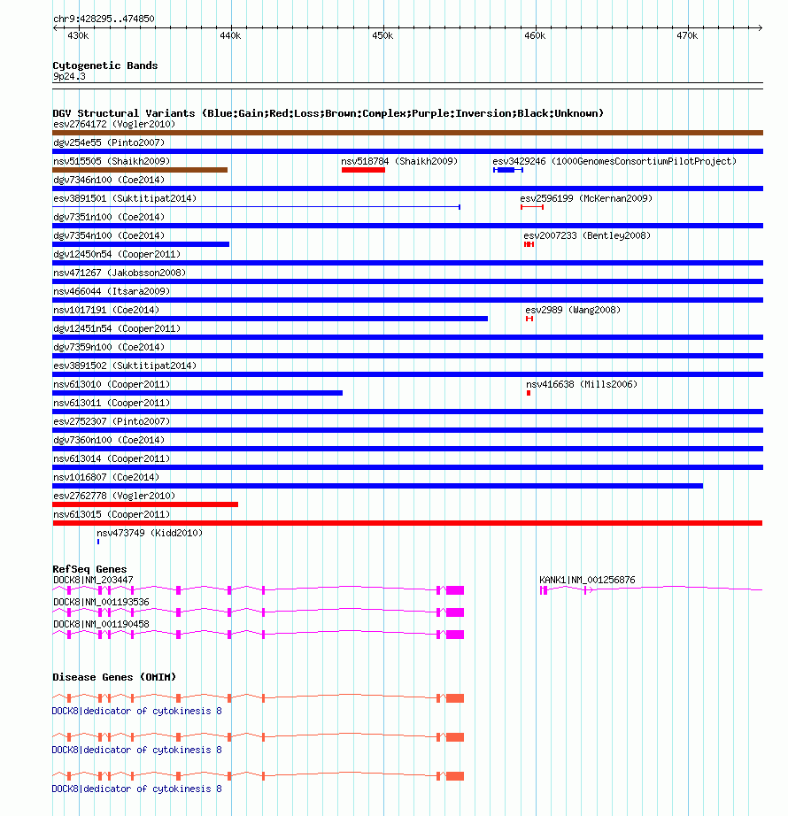 | | Variant Type | CNV loss | | Copy Number | | | Allele State | | | Allele Origin | | | Probe Count | | | Validation Flag | | | Merged Status | M | | Merged Variants | | | Supporting Variants | nssv1125978 | | Samples | | | Known Genes | DOCK8, KANK1 | | Method | SNP array | | Analysis | Illumina SNP array copy number analysis | | Platform | Not reported | | Comments | | | Reference | Cooper_et_al_2011 | | Pubmed ID | 21841781 | | Accession Number(s) | nsv613015