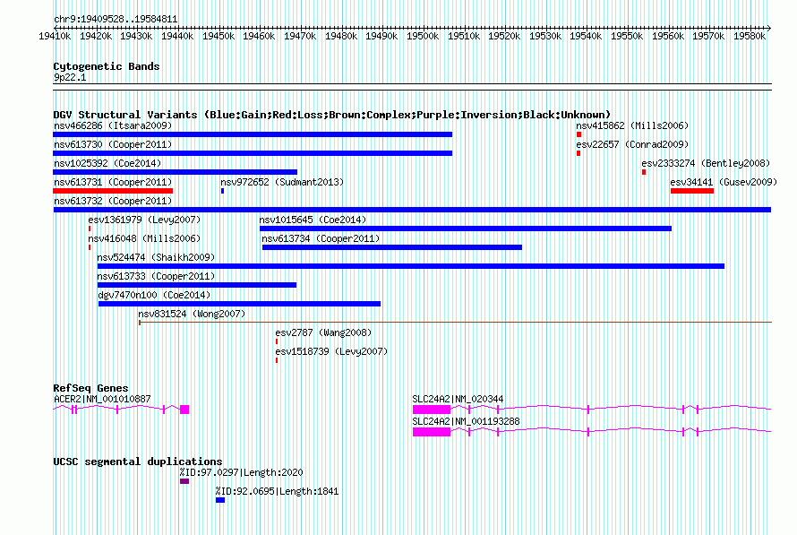 Variant DetailsVariant: nsv613732| Internal ID | 16054455 | | Landmark | | | Location Information | | | Cytoband | 9p22.1 | | Allele length | | Assembly | Allele length | | hg38 | 175284 | | hg19 | 175284 | | hg18 | 175284 |