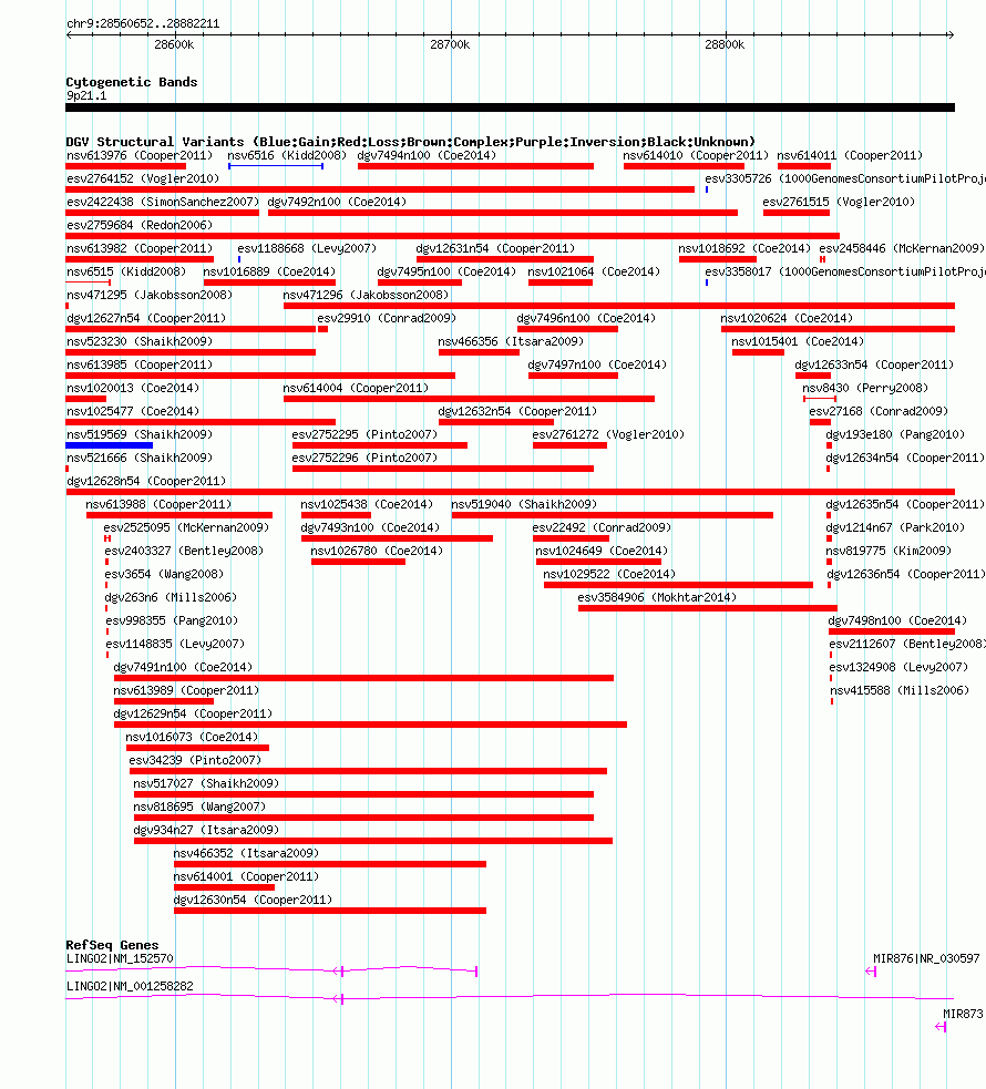 | Variant Type | CNV loss | Copy Number | | Allele State | | Allele Origin | | Probe Count | | Validation Flag | | Merged Status | M | Merged Variants | dgv12628n54 | Supporting Variants | nssv1132130 | Samples | | Known Genes | LINGO2, MIR873, MIR876 | Method | SNP array | Analysis | Illumina SNP array copy number analysis | Platform | Not reported | Comments | | Reference | Cooper_et_al_2011 | Pubmed ID | 21841781 | Accession Number(s) | nsv613987