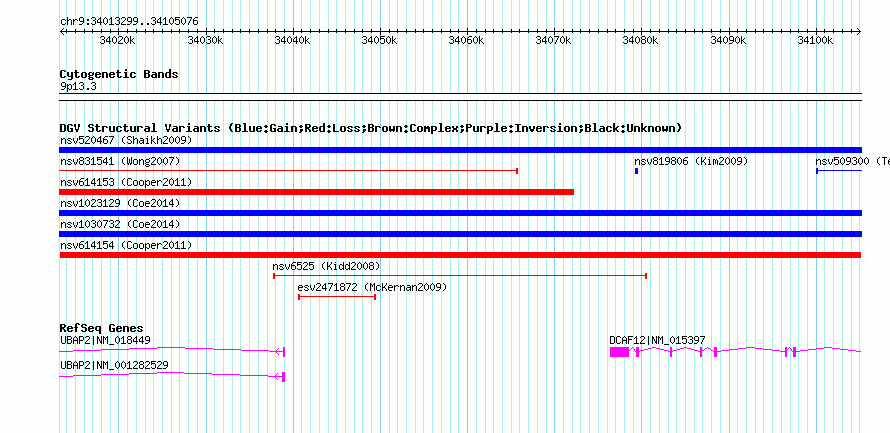 Variant DetailsVariant: nsv614154| Internal ID | 16401563 | | Landmark | | | Location Information | | | Cytoband | 9p13.3 | | Allele length | | Assembly | Allele length | | hg38 | 91778 | | hg19 | 91778 | | hg18 | 91778 |