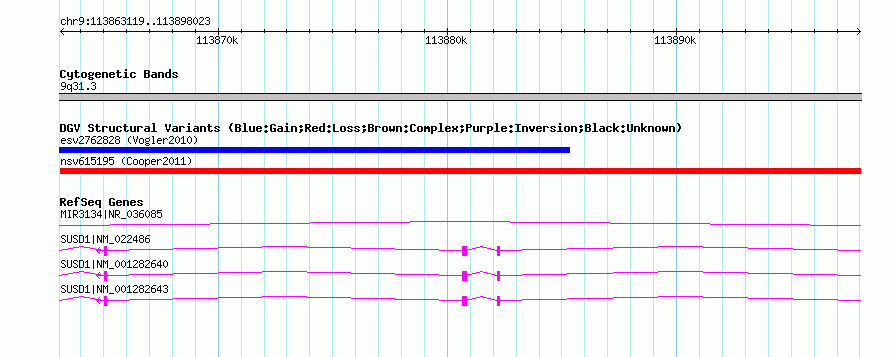 | | Variant Type | CNV loss | | Copy Number | | | Allele State | | | Allele Origin | | | Probe Count | | | Validation Flag | | | Merged Status | M | | Merged Variants | | | Supporting Variants | nssv1141242 | | Samples | | | Known Genes | MIR3134, SUSD1 | | Method | SNP array | | Analysis | Illumina SNP array copy number analysis | | Platform | Not reported | | Comments | | | Reference | Cooper_et_al_2011 | | Pubmed ID | 21841781 | | Accession Number(s) | nsv615195