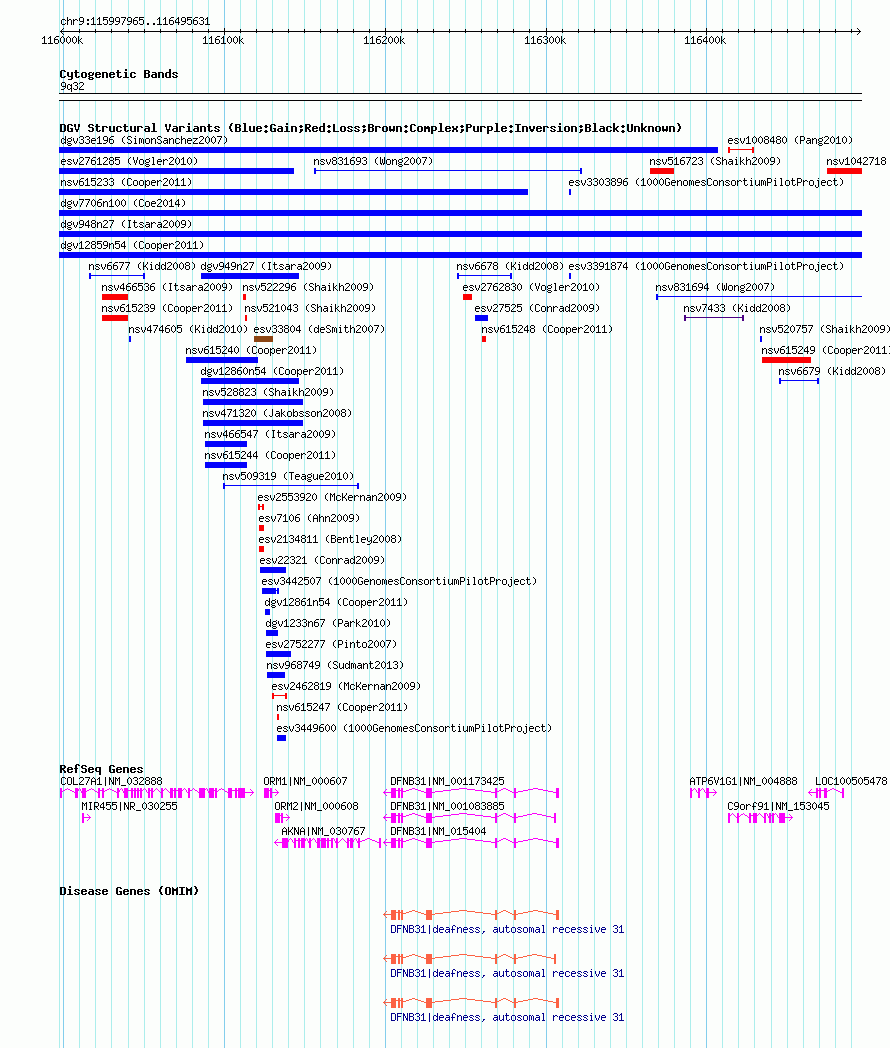 | | Variant Type | CNV gain | | Copy Number | | | Allele State | | | Allele Origin | | | Probe Count | | | Validation Flag | | | Merged Status | M | | Merged Variants | dgv12859n54 | | Supporting Variants | nssv1141266 | | Samples | | | Known Genes | AKNA, ATP6V1G1, C9orf91, COL27A1, DFNB31, LOC100505478, MIR455, ORM1, ORM2 | | Method | SNP array | | Analysis | Illumina SNP array copy number analysis | | Platform | Not reported | | Comments | | | Reference | Cooper_et_al_2011 | | Pubmed ID | 21841781 | | Accession Number(s) | nsv615236