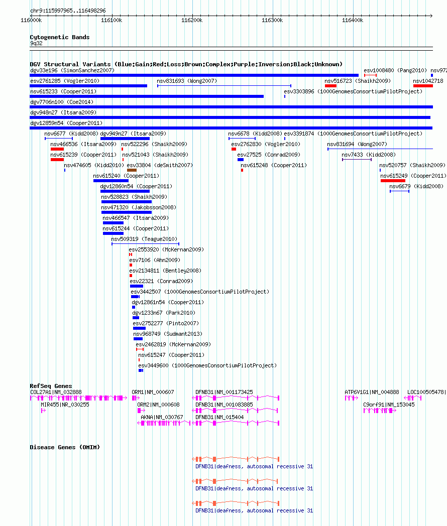 | | Variant Type | CNV gain | | Copy Number | | | Allele State | | | Allele Origin | | | Probe Count | | | Validation Flag | | | Merged Status | M | | Merged Variants | dgv12859n54 | | Supporting Variants | nssv1141268 | | Samples | | | Known Genes | AKNA, ATP6V1G1, C9orf91, COL27A1, DFNB31, LOC100505478, MIR455, ORM1, ORM2 | | Method | SNP array | | Analysis | Illumina SNP array copy number analysis | | Platform | Not reported | | Comments | | | Reference | Cooper_et_al_2011 | | Pubmed ID | 21841781 | | Accession Number(s) | nsv615238