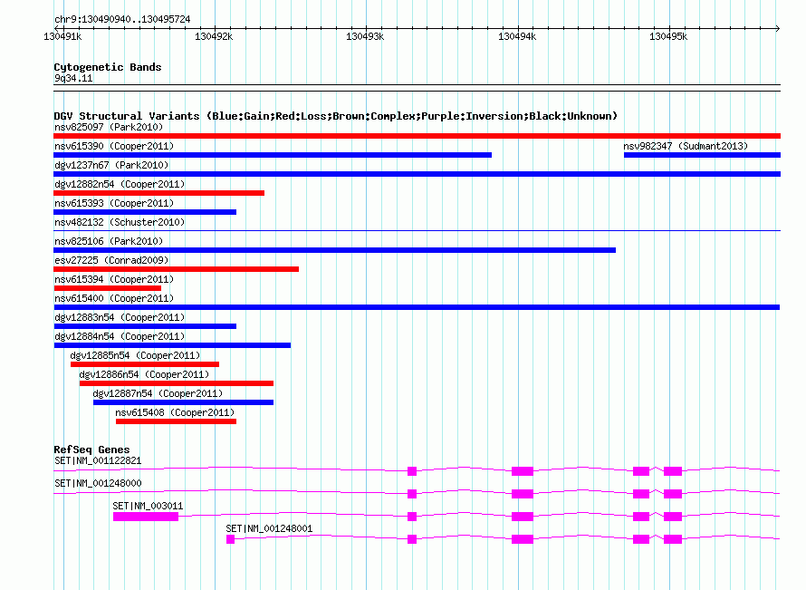 | Variant Type | CNV gain | Copy Number | | Allele State | | Allele Origin | | Probe Count | | Validation Flag | | Merged Status | M | Merged Variants | | Supporting Variants | nssv1143244, nssv1143245 | Samples | | Known Genes | SET | Method | SNP array | Analysis | Illumina SNP array copy number analysis | Platform | Not reported | Comments | | Reference | Cooper_et_al_2011 | Pubmed ID | 21841781 | Accession Number(s) | nsv615400