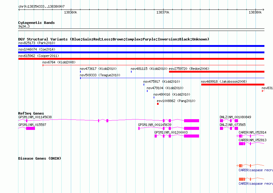 Variant DetailsVariant: nsv615962| Internal ID | 16056685 | | Landmark | | | Location Information | | | Cytoband | 9q34.3 | | Allele length | | Assembly | Allele length | | hg38 | 26580 | | hg19 | 26575 | | hg18 | 26575 |