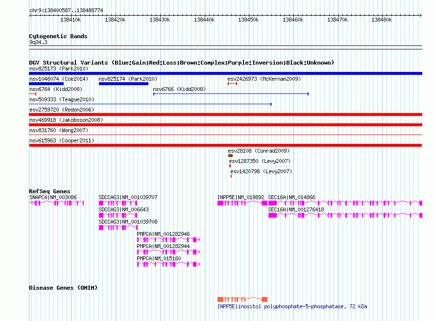 Variant DetailsVariant: nsv615963| Internal ID | 16403372 | | Landmark | | | Location Information | | | Cytoband | 9q34.3 | | Allele length | | Assembly | Allele length | | hg38 | 88188 | | hg19 | 88188 | | hg18 | 88188 |
