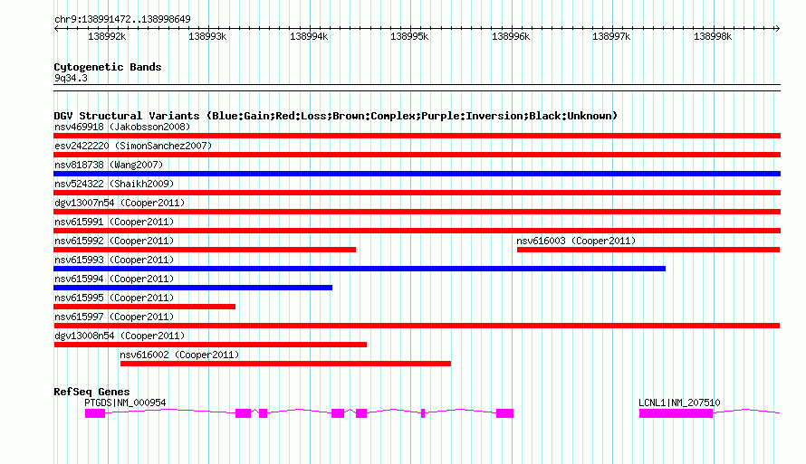 Variant DetailsVariant: nsv615997| Internal ID | 16056720 | | Landmark | | | Location Information | | | Cytoband | 9q34.3 | | Allele length | | Assembly | Allele length | | hg38 | 7178 | | hg19 | 7178 | | hg18 | 7178 |