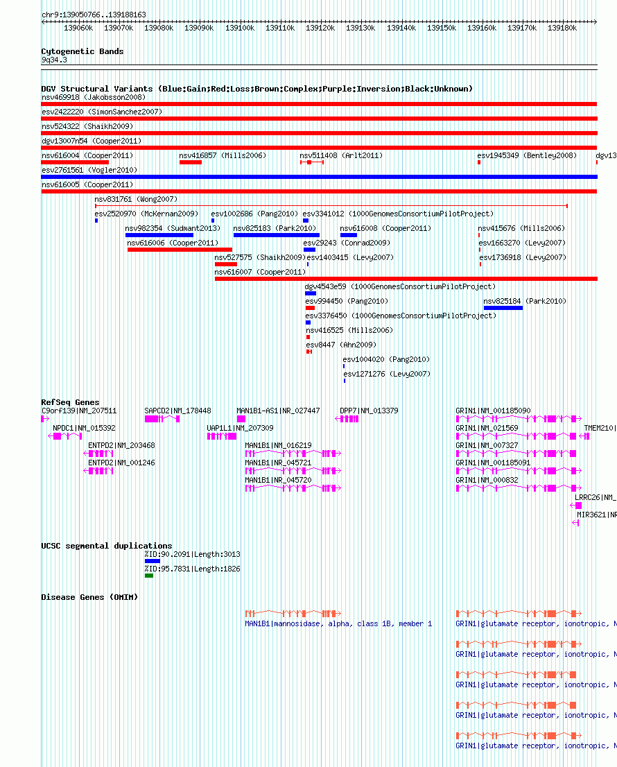 | | Variant Type | CNV loss | | Copy Number | | | Allele State | | | Allele Origin | | | Probe Count | | | Validation Flag | | | Merged Status | M | | Merged Variants | | | Supporting Variants | nssv1148359 | | Samples | | | Known Genes | C9orf139, DPP7, ENTPD2, GRIN1, LRRC26, MAN1B1, MAN1B1-AS1, MIR3621, NPDC1, SAPCD2, TMEM210, UAP1L1 | | Method | SNP array | | Analysis | Illumina SNP array copy number analysis | | Platform | Not reported | | Comments | | | Reference | Cooper_et_al_2011 | | Pubmed ID | 21841781 | | Accession Number(s) | nsv616005