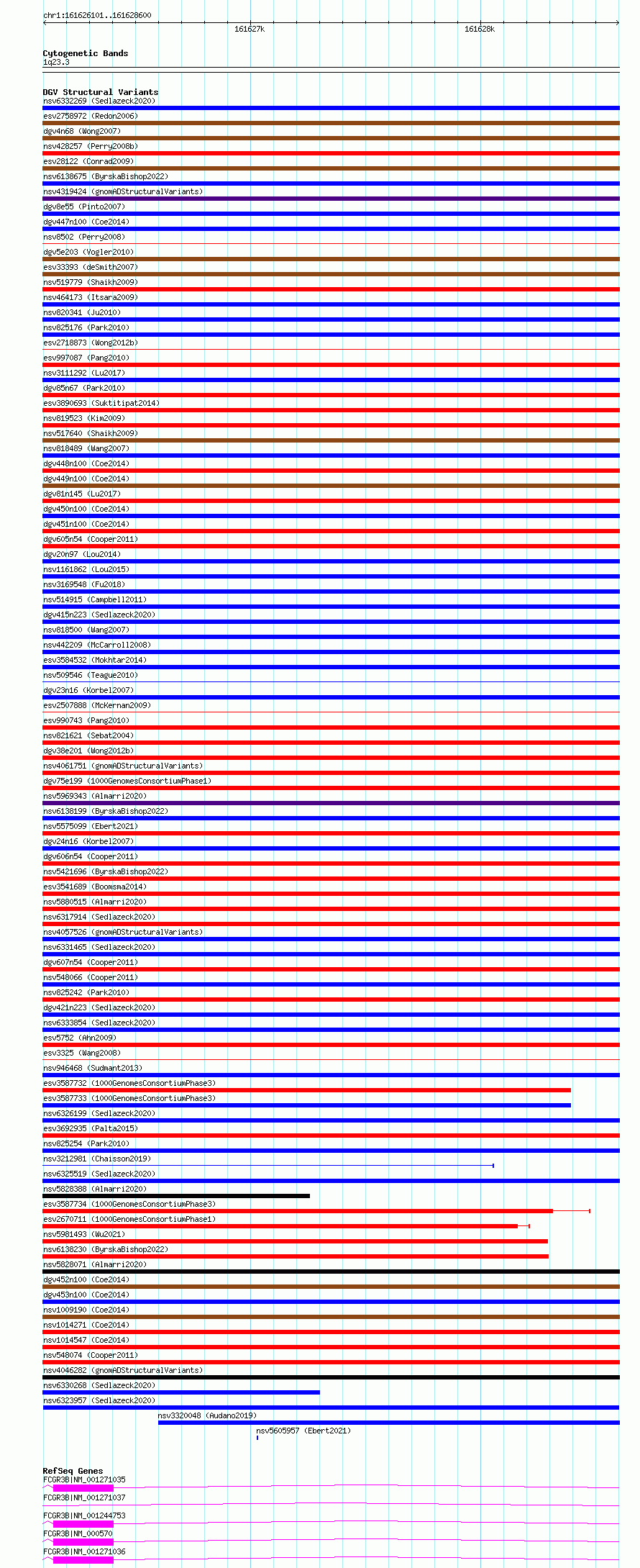 Variant DetailsVariant: nsv6323957| Internal ID | 20857080 | | Landmark | | | Location Information | | | Cytoband | 1q23.3 | | Allele length | | Assembly | Allele length | | hg38 | 2500 | | hg19 | 2500 |