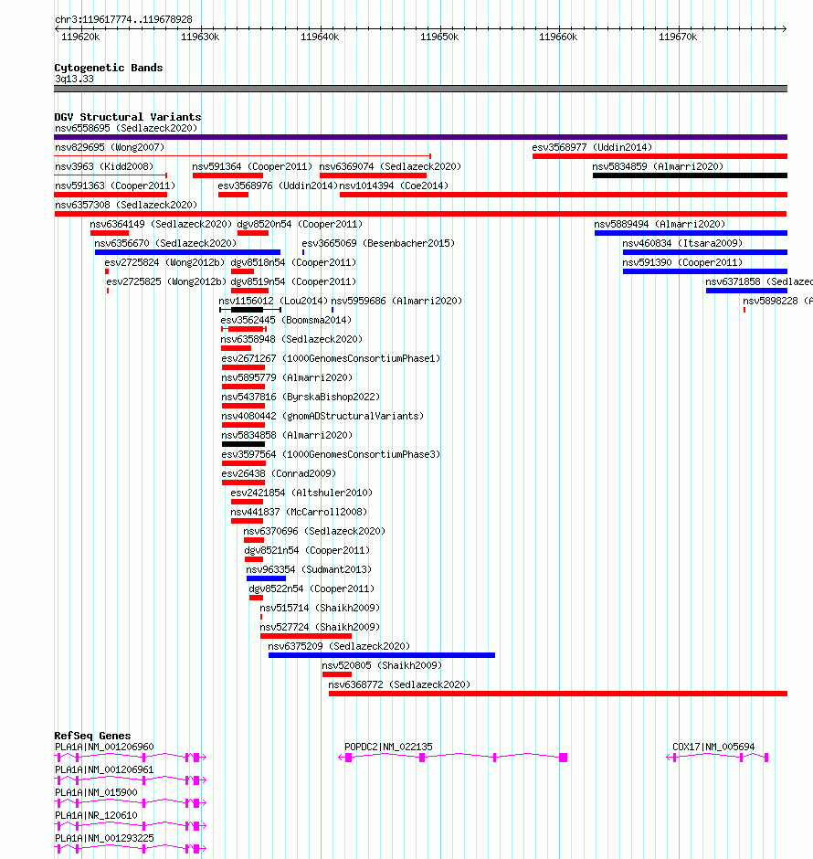 Variant DetailsVariant: nsv6357308| Internal ID | 21014861 | | Landmark | | | Location Information | | | Cytoband | 3q13.33 | | Allele length | | Assembly | Allele length | | hg38 | 61155 | | hg19 | 61155 |