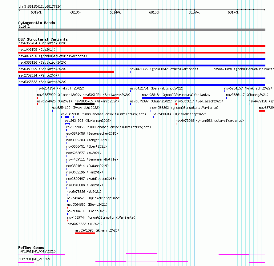 Variant DetailsVariant: nsv6365632| Internal ID | 21023185 | | Landmark | | | Location Information | | | Cytoband | 3p14.1 | | Allele length | | Assembly | Allele length | | hg38 | 62509 | | hg19 | 62509 |