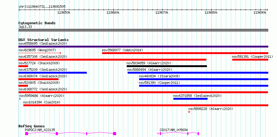 Variant DetailsVariant: nsv6368772| Internal ID | 21026325 | | Landmark | | | Location Information | | | Cytoband | 3q13.33 | | Allele length | | Assembly | Allele length | | hg38 | 50775 | | hg19 | 50775 |