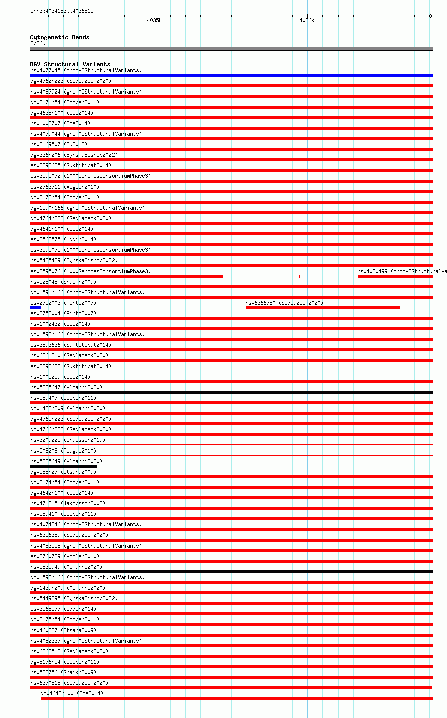 Variant DetailsVariant: nsv6370818| Internal ID | 21028371 | | Landmark | | | Location Information | | | Cytoband | 3p26.1 | | Allele length | | Assembly | Allele length | | hg38 | 2633 | | hg19 | 2633 |