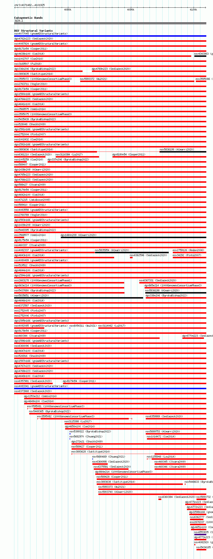 Variant DetailsVariant: nsv6374564| Internal ID | 21032117 | | Landmark | | | Location Information | | | Cytoband | 3p26.1 | | Allele length | | Assembly | Allele length | | hg38 | 30444 | | hg19 | 30444 |
