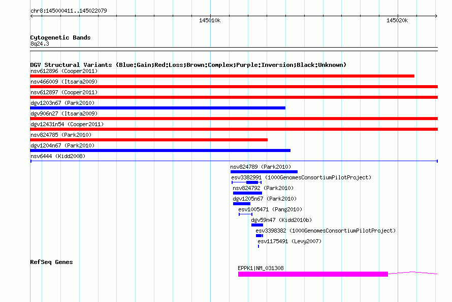 Variant DetailsVariant: nsv6444| Internal ID | 15551354 | | Landmark | | | Location Information | | | Cytoband | 8q24.3 | | Allele length | | Assembly | Allele length | | hg38 | 8206 | | hg19 | 8206 | | hg18 | 8206 | | hg17 | 8206 |