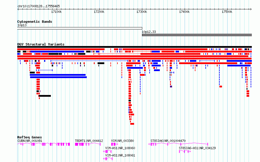 | | Variant Type | CNV deletion | | Copy Number | | | Allele State | | | Allele Origin | | | Probe Count | | | Validation Flag | | | Merged Status | M | | Merged Variants | | | Supporting Variants | nssv17978947 | | Samples | | | Known Genes | CUBN, ST8SIA6, ST8SIA6-AS1, TRDMT1, VIM, VIM-AS1 | | Method | Sequencing | | Analysis | | | Platform | | | Comments | | | Reference | Sedlazeck_et_al_2020 | | Pubmed ID | 99999999 | | Accession Number(s) | nsv6448356
