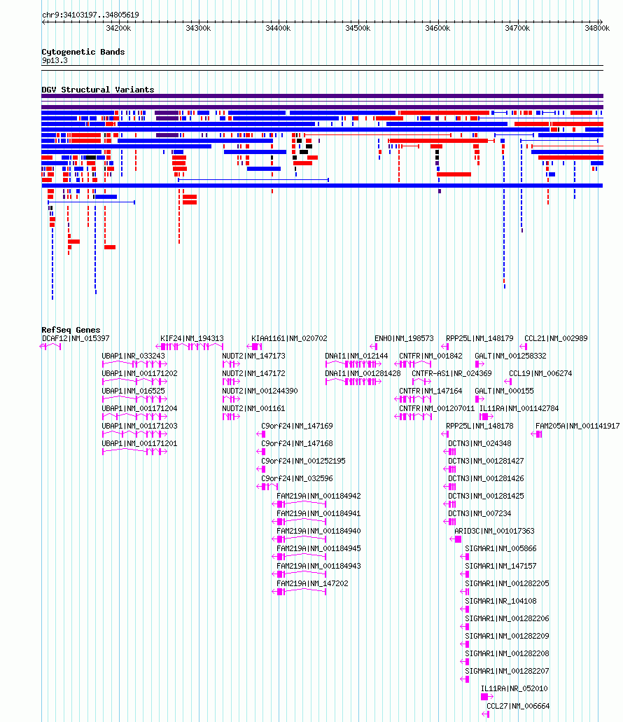 | | Variant Type | CNV duplication | | Copy Number | | | Allele State | | | Allele Origin | | | Probe Count | | | Validation Flag | | | Merged Status | M | | Merged Variants | | | Supporting Variants | nssv18223736 | | Samples | | | Known Genes | ARID3C, C9orf24, CCL19, CCL21, CCL27, CNTFR, CNTFR-AS1, DCAF12, DCTN3, DNAI1, ENHO, FAM205A, FAM219A, GALT, IL11RA, KIAA1161, KIF24, NUDT2, RPP25L, SIGMAR1, UBAP1 | | Method | Sequencing | | Analysis | | | Platform | | | Comments | | | Reference | Sedlazeck_et_al_2020 | | Pubmed ID | 99999999 | | Accession Number(s) | nsv6449537