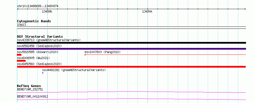 | | Variant Type | CNV deletion | | Copy Number | | | Allele State | | | Allele Origin | | | Probe Count | | | Validation Flag | | | Merged Status | M | | Merged Variants | | | Supporting Variants | nssv17979028 | | Samples | | | Known Genes | BEND7 | | Method | Sequencing | | Analysis | | | Platform | | | Comments | | | Reference | Sedlazeck_et_al_2020 | | Pubmed ID | 99999999 | | Accession Number(s) | nsv6450560