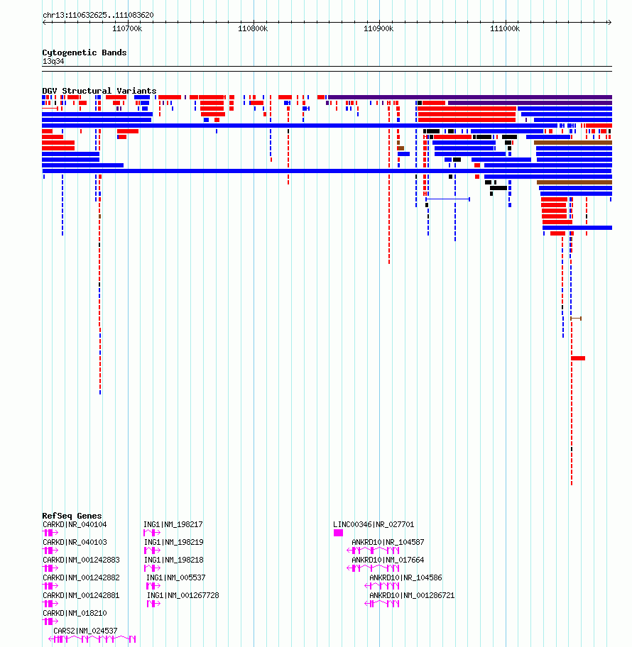 Variant DetailsVariant: nsv6483799| Internal ID | 21141352 | | Landmark | | | Location Information | | | Cytoband | 13q34 | | Allele length | | Assembly | Allele length | | hg38 | 450996 | | hg19 | 450996 |