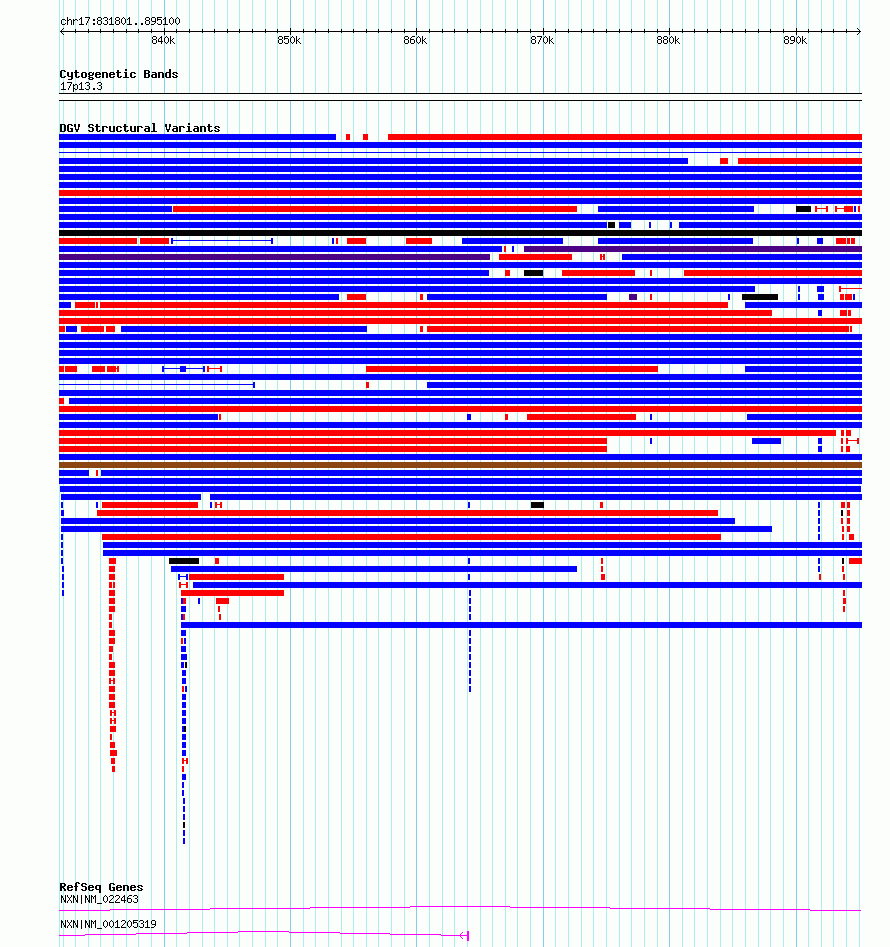 Variant DetailsVariant: nsv6496386| Internal ID | 20869588 | | Landmark | | | Location Information | | | Cytoband | 17p13.3 | | Allele length | | Assembly | Allele length | | hg38 | 63300 | | hg19 | 63300 |