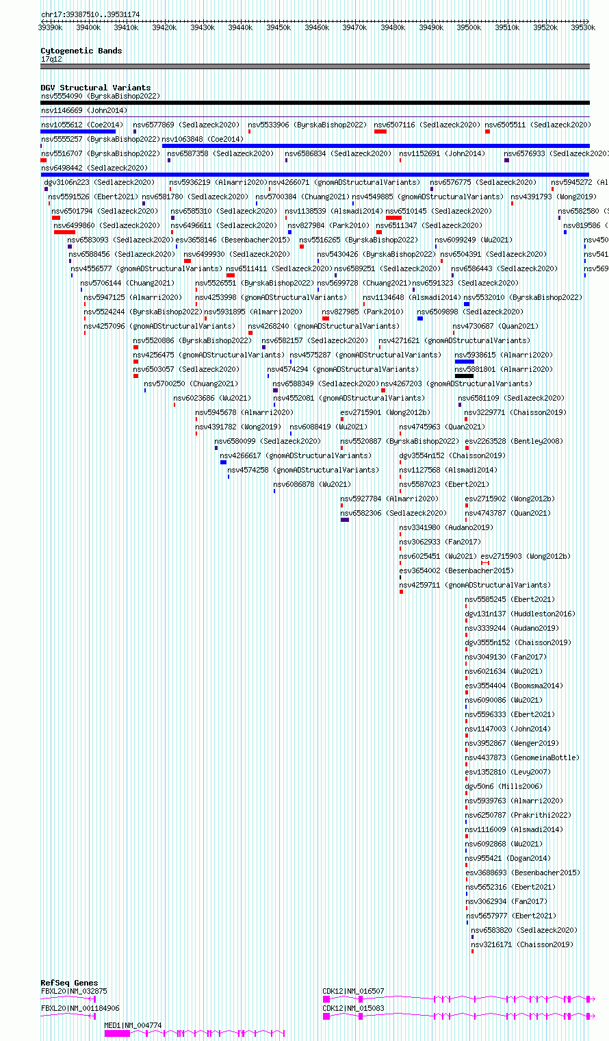 | | Variant Type | CNV duplication | | Copy Number | | | Allele State | | | Allele Origin | | | Probe Count | | | Validation Flag | | | Merged Status | M | | Merged Variants | | | Supporting Variants | nssv18194100 | | Samples | | | Known Genes | CDK12, FBXL20, MED1 | | Method | Sequencing | | Analysis | | | Platform | | | Comments | | | Reference | Sedlazeck_et_al_2020 | | Pubmed ID | 99999999 | | Accession Number(s) | nsv6498442