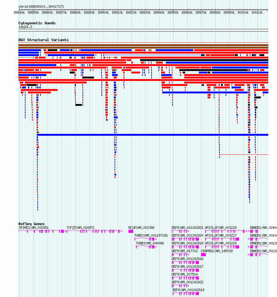 | | Variant Type | CNV deletion | | Copy Number | | | Allele State | | | Allele Origin | | | Probe Count | | | Validation Flag | | | Merged Status | M | | Merged Variants | | | Supporting Variants | nssv18033839 | | Samples | | | Known Genes | AFG3L1P, CENPBD1, DBNDD1, DEF8, MC1R, SPIRE2, TCF25, TUBB3 | | Method | Sequencing | | Analysis | | | Platform | | | Comments | | | Reference | Sedlazeck_et_al_2020 | | Pubmed ID | 99999999 | | Accession Number(s) | nsv6500661
