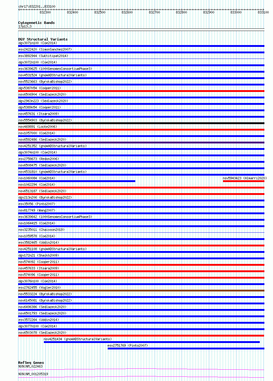 Variant DetailsVariant: nsv6503078| Internal ID | 20876329 | | Landmark | | | Location Information | | | Cytoband | 17p13.3 | | Allele length | | Assembly | Allele length | | hg38 | 900 | | hg19 | 900 |