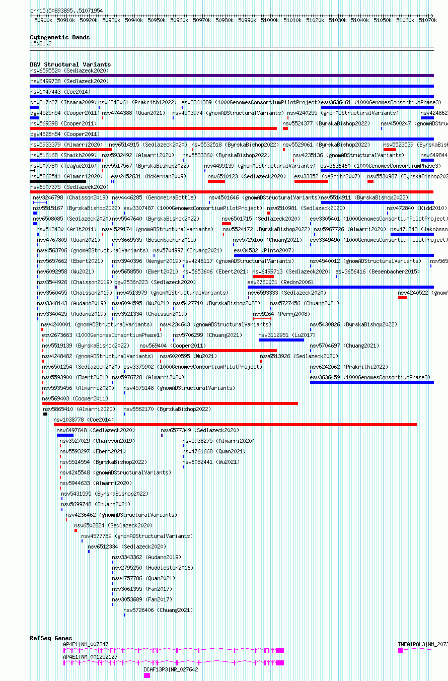 | | Variant Type | CNV deletion | | Copy Number | | | Allele State | | | Allele Origin | | | Probe Count | | | Validation Flag | | | Merged Status | M | | Merged Variants | | | Supporting Variants | nssv18025215 | | Samples | | | Known Genes | AP4E1, DCAF13P3, TNFAIP8L3 | | Method | Sequencing | | Analysis | | | Platform | | | Comments | | | Reference | Sedlazeck_et_al_2020 | | Pubmed ID | 99999999 | | Accession Number(s) | nsv6507375