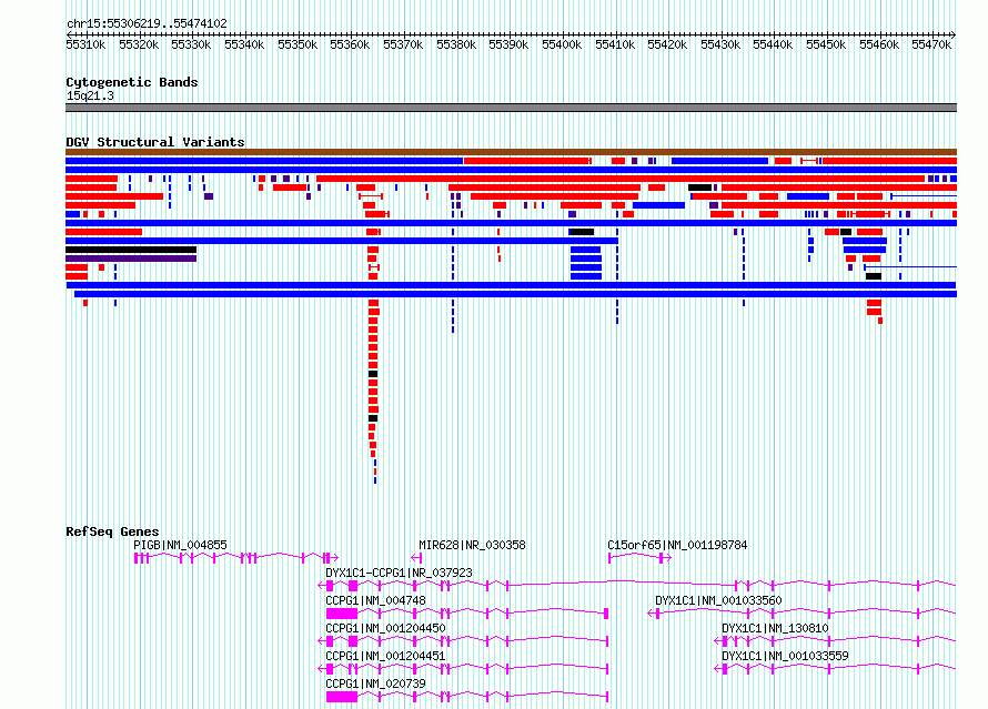 | | Variant Type | CNV duplication | | Copy Number | | | Allele State | | | Allele Origin | | | Probe Count | | | Validation Flag | | | Merged Status | M | | Merged Variants | | | Supporting Variants | nssv18185164 | | Samples | | | Known Genes | C15orf65, CCPG1, DYX1C1, DYX1C1-CCPG1, MIR628, PIGB | | Method | Sequencing | | Analysis | | | Platform | | | Comments | | | Reference | Sedlazeck_et_al_2020 | | Pubmed ID | 99999999 | | Accession Number(s) | nsv6515550