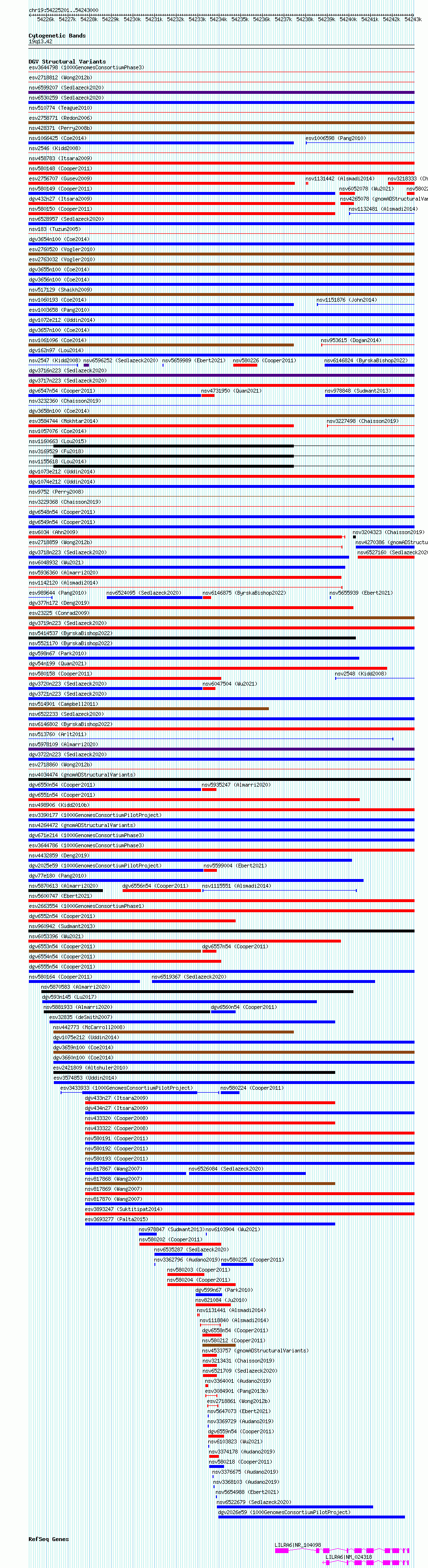 Variant DetailsVariant: nsv6524635| Internal ID | 20897996 | | Landmark | | | Location Information | | | Cytoband | 19q13.42 | | Allele length | | Assembly | Allele length | | hg38 | 17800 | | hg19 | 17777 |