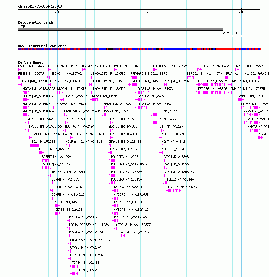 | | Variant Type | CNV duplication | | Copy Number | | | Allele State | | | Allele Origin | | | Probe Count | | | Validation Flag | | | Merged Status | M | | Merged Variants | | | Supporting Variants | nssv18206824 | | Samples | | | Known Genes | A4GALT, ARFGAP3, ATP5L2, BIK, C22orf46, CCDC134, CENPM, CSDC2, CYB5R3, CYP2D6, CYP2D7P, DESI1, EFCAB6, EFCAB6-AS1, FAM109B, LINC00634, LOC388906, MCAT, MEI1, MIR33A, MPPED1, NAGA, NDUFA6, NDUFA6-AS1, NFAM1, NHP2L1, PACSIN2, PARVB, PARVG, PMM1, PNPLA3, PNPLA5, POLDIP3, RNU12, RRP7A, RRP7B, SAMM50, SCUBE1, SEPT3, SERHL, SERHL2, SHISA8, SMDT1, SREBF2, SULT4A1, TCF20, TNFRSF13C, TSPO, TTLL1, TTLL12, WBP2NL, XRCC6 | | Method | Sequencing | | Analysis | | | Platform | | | Comments | | | Reference | Sedlazeck_et_al_2020 | | Pubmed ID | 99999999 | | Accession Number(s) | nsv6535893