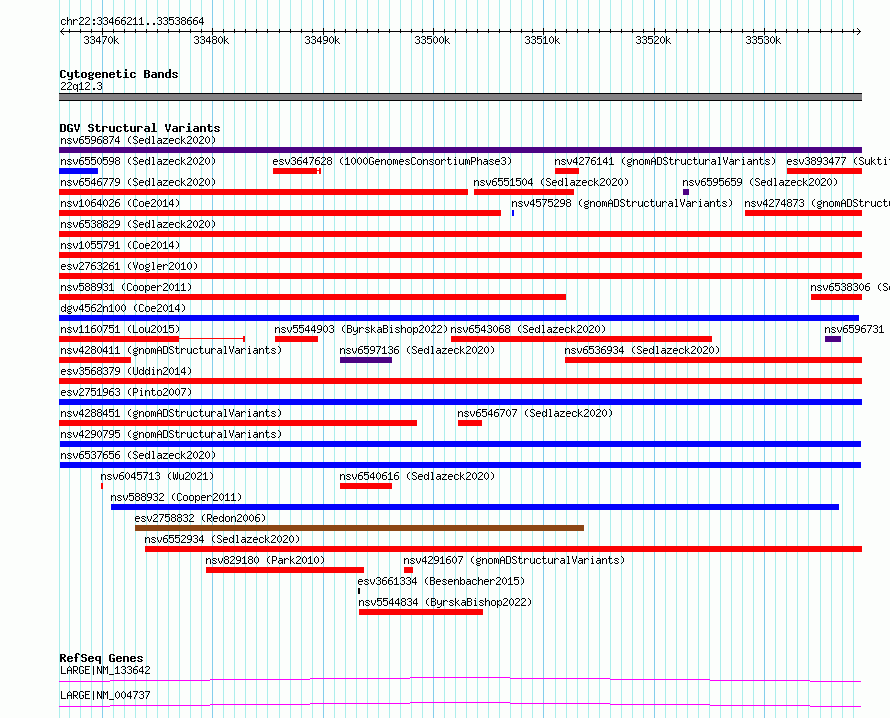 Variant DetailsVariant: nsv6537656| Internal ID | 20910992 | | Landmark | | | Location Information | | | Cytoband | 22q12.3 | | Allele length | | Assembly | Allele length | | hg38 | 72454 | | hg19 | 72454 |