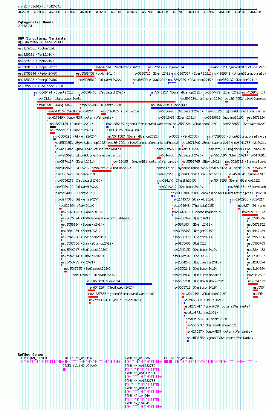 Variant DetailsVariant: nsv6555083| Internal ID | 20928172 | | Landmark | | | Location Information | | | Cytoband | 22q13.31 | | Allele length | | Assembly | Allele length | | hg38 | 154665 | | hg19 | 154665 |