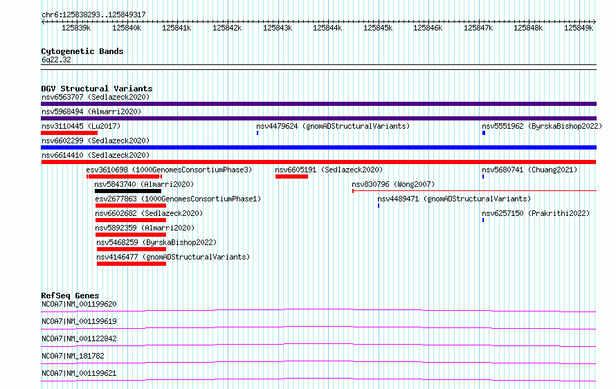 Variant DetailsVariant: nsv6614410| Internal ID | 20987481 | | Landmark | | | Location Information | | | Cytoband | 6q22.32 | | Allele length | | Assembly | Allele length | | hg38 | 11025 | | hg19 | 11025 |