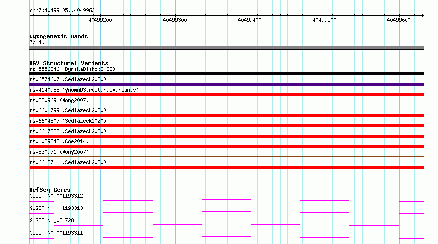 Variant DetailsVariant: nsv6618711| Internal ID | 20991782 | | Landmark | | | Location Information | | | Cytoband | 7p14.1 | | Allele length | | Assembly | Allele length | | hg38 | 527 | | hg19 | 527 |