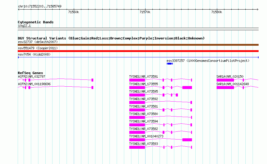 Variant DetailsVariant: nsv7054| Internal ID | 15552025 | | Landmark | | | Location Information | | | Cytoband | 10q22.1 | | Allele length | | Assembly | Allele length | | hg38 | 6200 | | hg19 | 6200 | | hg18 | 6200 | | hg17 | 6200 |