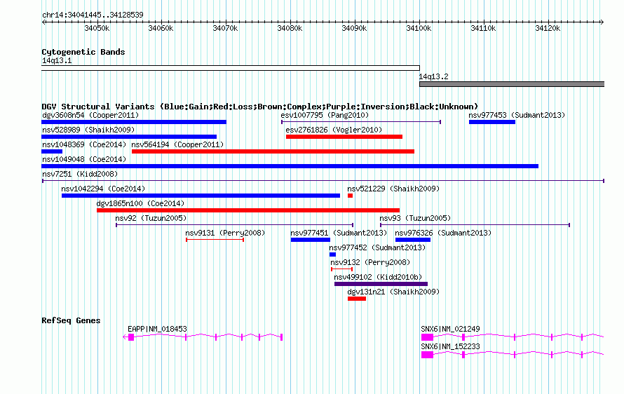 Variant DetailsVariant: nsv7251| Internal ID | 15552242 | | Landmark | | | Location Information | | | Cytoband | 14q13.1 | | Allele length | | Assembly | Allele length | | hg38 | 87095 | | hg19 | 87095 | | hg18 | 87095 | | hg17 | 87095 |