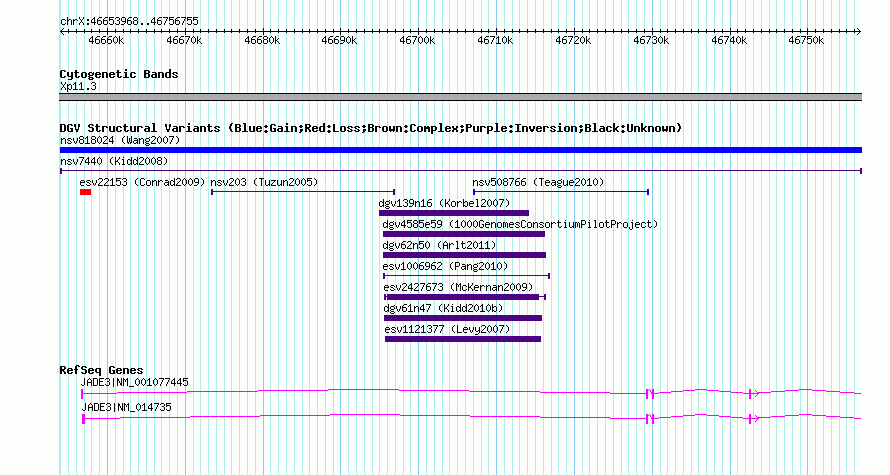 | Variant Type | OTHER inversion | Copy Number | | Allele State | | Allele Origin | | Probe Count | | Validation Flag | | Merged Status | M | Merged Variants | | Supporting Variants | nssv860, nssv10700, nssv3779, nssv5217, nssv861, nssv9480, nssv1834, nssv5216, nssv9776, nssv11214, nssv10701, nssv6323, nssv9927, nssv6324, nssv3780, nssv9479, nssv1833 | Samples | NA18507, NA12156, NA12878, NA18956, NA15510, NA18555, NA18517, NA19240, NA19129 | Known Genes | JADE3 | Method | Sequencing | Analysis | End-sequence pairs were mapped to the human genome assembly (hg17) using a previously described algorithm (Tuzun et al 2005) | Platform | Capillary | Comments | | Reference | Kidd_et_al_2008 | Pubmed ID | 18451855 | Accession Number(s) | nsv7440