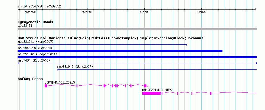 | Variant Type | CNV insertion | Copy Number | | Allele State | | Allele Origin | | Probe Count | | Validation Flag | | Merged Status | M | Merged Variants | | Supporting Variants | nssv6406, nssv10772 | Samples | NA12156, NA18956 | Known Genes | ANKRD22, LIPM | Method | Sequencing | Analysis | End-sequence pairs were mapped to the human genome assembly (hg17) using a previously described algorithm (Tuzun et al 2005) | Platform | Capillary | Comments | | Reference | Kidd_et_al_2008 | Pubmed ID | 18451855 | Accession Number(s) | nsv7484
