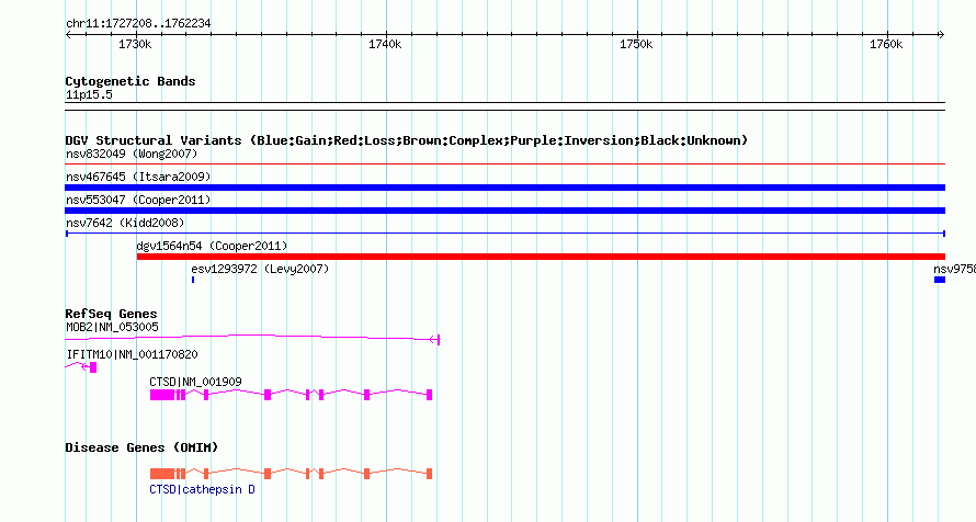Variant DetailsVariant: nsv7642| Internal ID | 15552672 | | Landmark | | | Location Information | | | Cytoband | 11p15.5 | | Allele length | | Assembly | Allele length | | hg38 | 6446 | | hg19 | 6446 | | hg18 | 6446 | | hg17 | 6446 |
