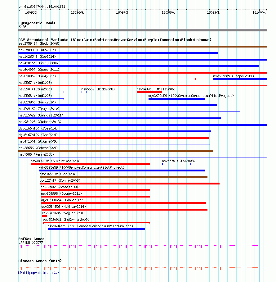 | | Variant Type | CNV gain | | Copy Number | | | Allele State | | | Allele Origin | | | Probe Count | | | Validation Flag | | | Merged Status | M | | Merged Variants | | | Supporting Variants | nssv15269, nssv14454, nssv15078, nssv15286, nssv16857, nssv13990, nssv13631, nssv16911, nssv14627, nssv15818, nssv14827, nssv15064, nssv14597, nssv14815, nssv14362, nssv15848, nssv14895, nssv13669, nssv17670, nssv14555, nssv17213, nssv17504, nssv15123, nssv14726 | | Samples | NA11830, NA18980, NA12155, NA18563, NA12802, NA18860, NA18942, NA07048, NA10839, NA18975, NA19007, NA10847, NA12872, NA18572, NA19221, NA18537, NA19132, NA18517, NA18564, NA19173, NA18972, NA18552 | | Known Genes | LPA | | Method | Oligo aCGH | | Analysis | Statistical threshold = 5.0, minimum +/- log2 ratio = 0.25 and minimum number of probes = 2 | | Platform | Agilent-015686 Custom Human 244K CGH Microarray | | Comments | | | Reference | Perry_et_al_2008 | | Pubmed ID | 18304495 | | Accession Number(s) | nsv7986