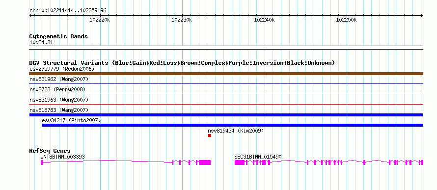 Variant DetailsVariant: nsv818783| Internal ID | 16407624 | | Landmark | | | Location Information | | | Cytoband | 10q24.31 | | Allele length | | Assembly | Allele length | | hg38 | 47783 | | hg19 | 47783 | | hg18 | 47783 | | hg17 | 47783 |