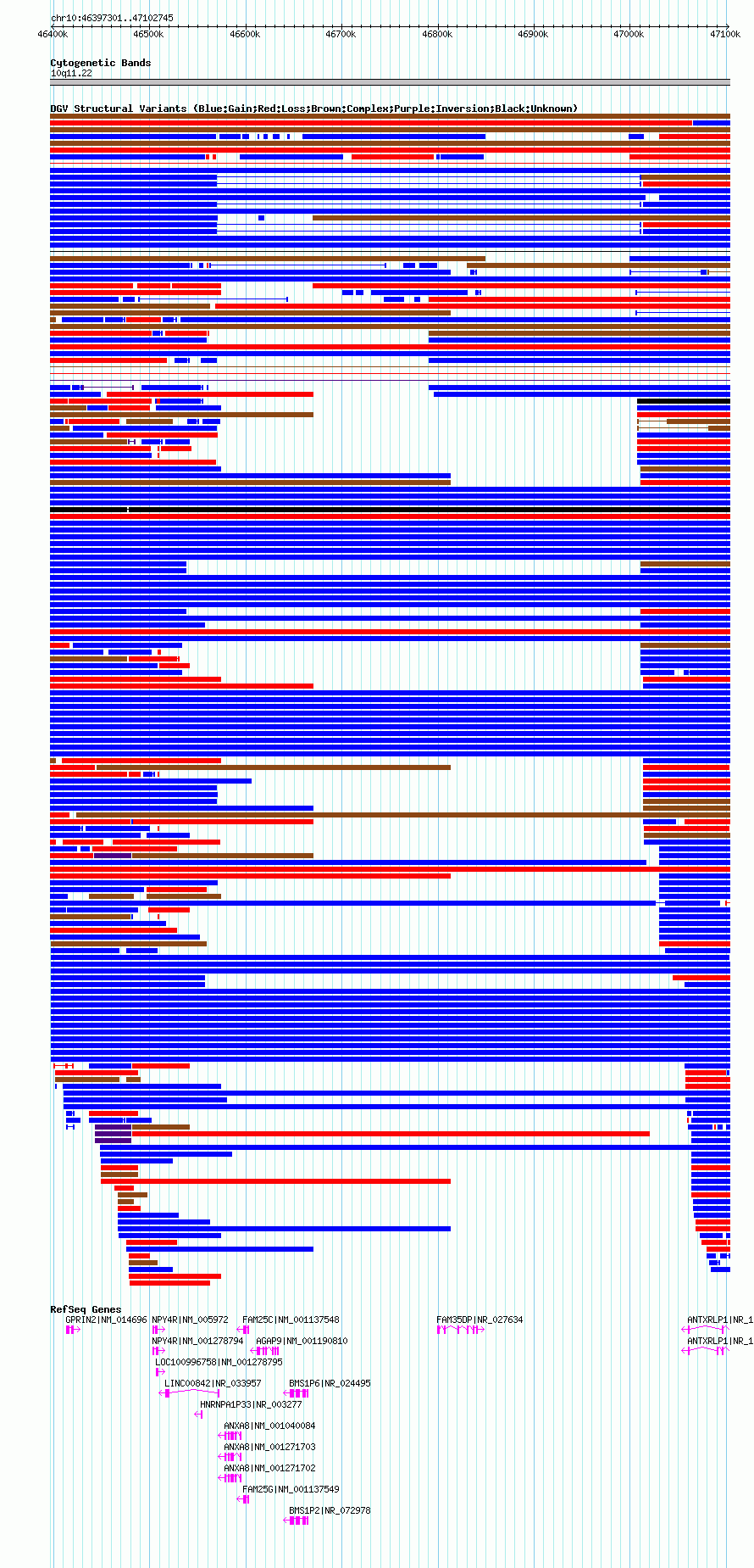 Variant DetailsVariant: nsv821667 | Internal ID | 16410728 | | Landmark | | | Location Information | | | Cytoband | 10q11.22 | | Allele length | | Assembly | Allele length | | hg19 | 655445 | | hg18 | 705445 | | hg17 | 705445 |