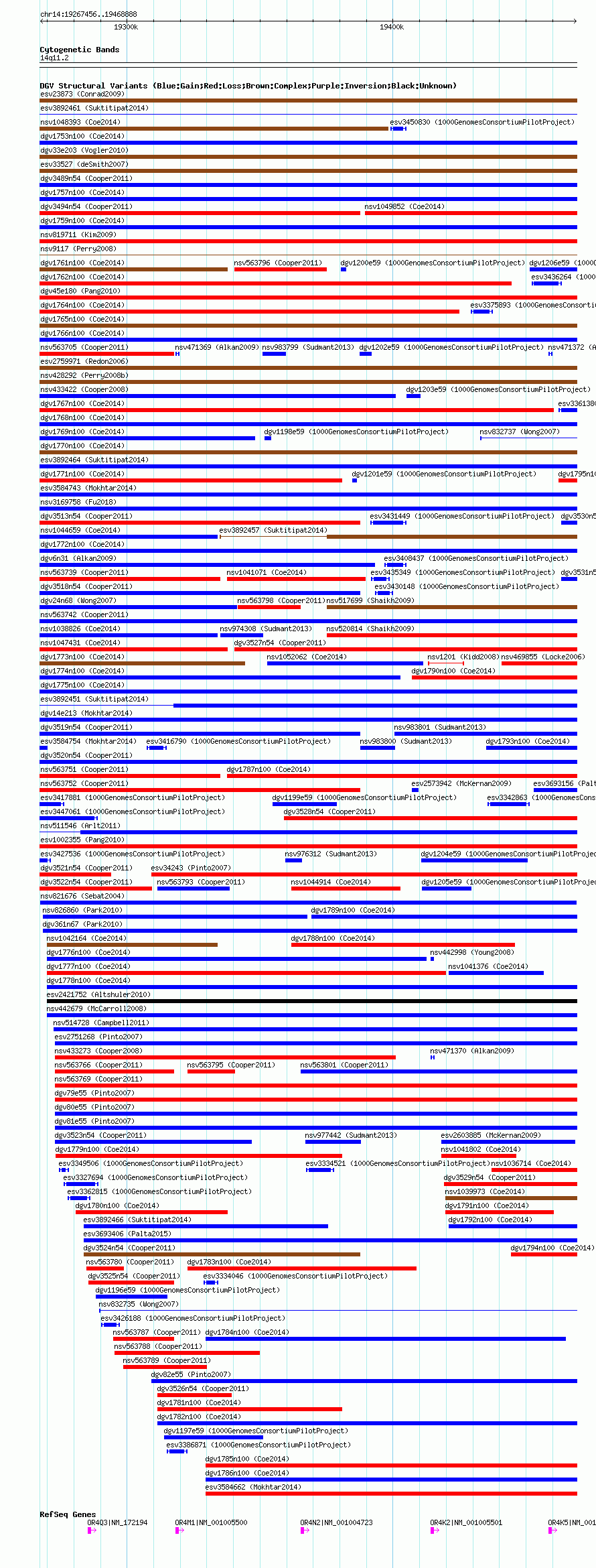 Variant DetailsVariant: nsv821676 | Internal ID | 16410737 | | Landmark | | | Location Information | | | Cytoband | 14q11.2 | | Allele length | | Assembly | Allele length | | hg38 | 201433 | | hg19 | 201433 | | hg18 | 201433 | | hg17 | 201433 |