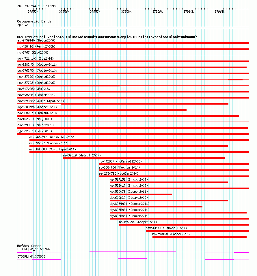Variant DetailsVariant: nsv822057 | Internal ID | 16431217 | | Landmark | | | Location Information | | | Cytoband | 3p22.2 | | Allele length | | Assembly | Allele length | | hg38 | 7418 | | hg19 | 7418 | | hg18 | 7418 |